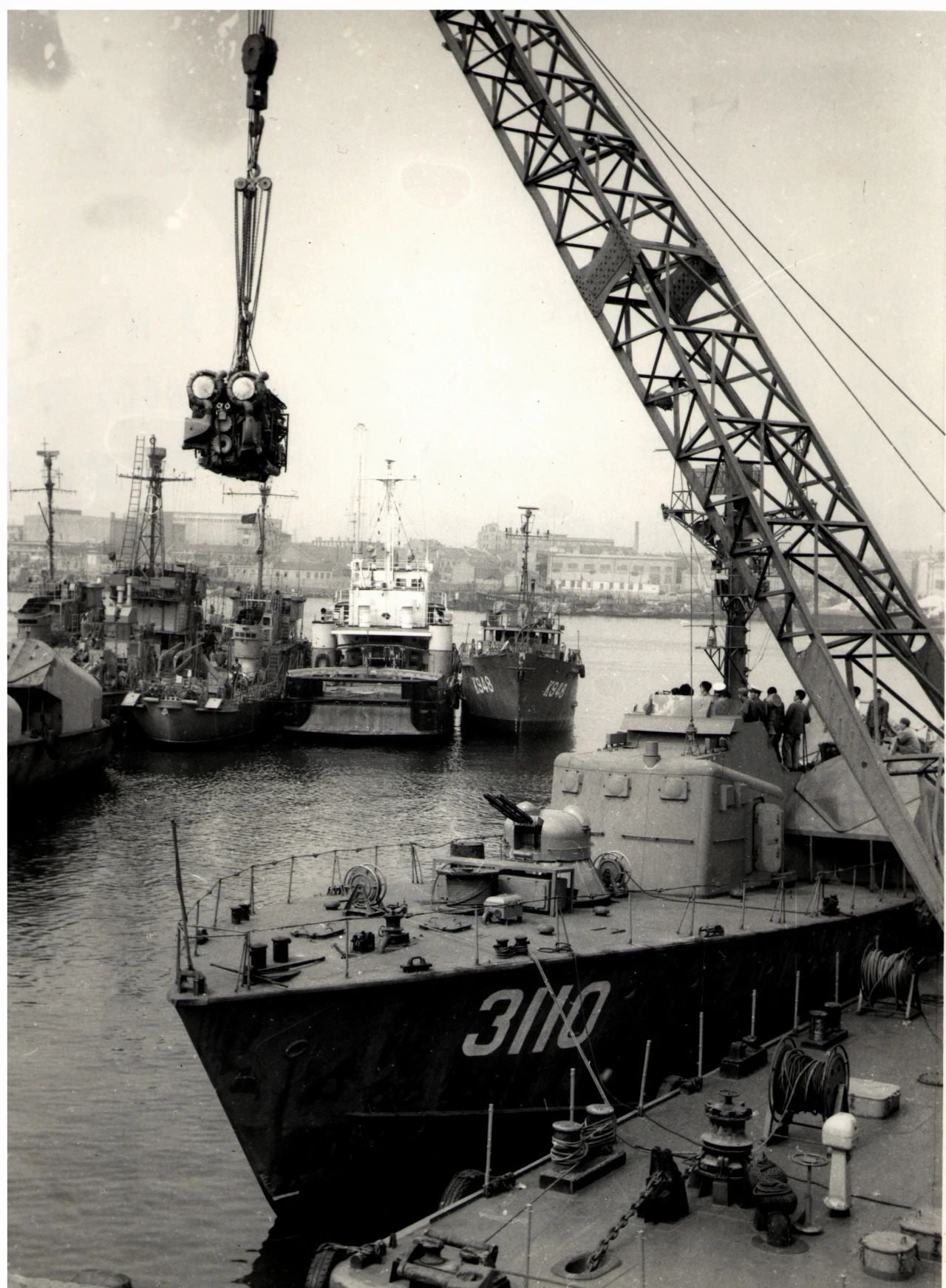 1950年廣州1950年,萬山海戰功臣“前進號”炮艇在工廠下水。