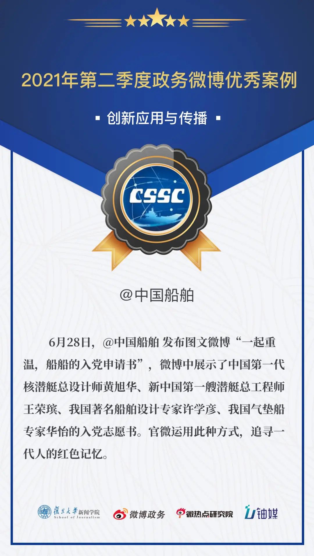 在幾百個微博政務(wù)賬號、幾千個微博政務(wù)優(yōu)秀案例的評選中,@中國船舶 憑借圖文微博“一起重溫,船船的入黨申請書”,再一次拿下“創(chuàng)新應(yīng)用與傳播”的獎勵,真的是太棒了!