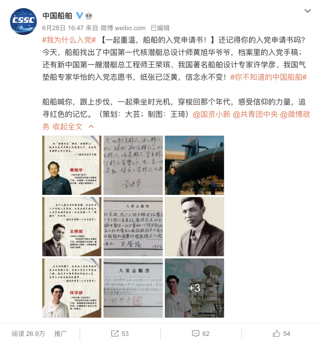 這篇微博展示了中國第一代核潛艇總設(shè)計(jì)師黃旭華、新中國第一艘潛艇總工程師王榮瑸、我國著名船舶設(shè)計(jì)專家許學(xué)彥、我國氣墊船專家華怡的親筆入黨志愿書,用一種時空穿越的方式,追尋一代人的紅色記憶,用船舶人的方式,慶祝建黨百年。