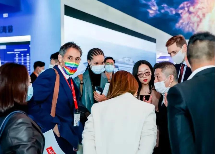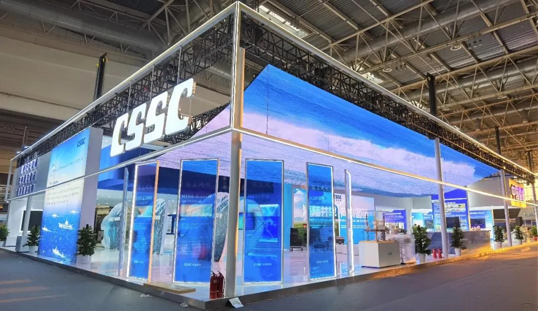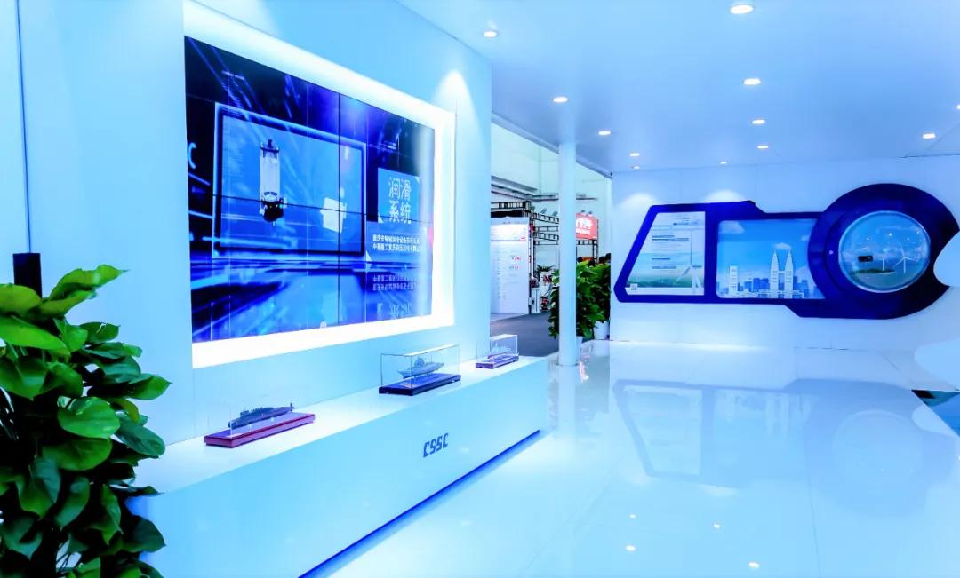 中國船舶集團(tuán)展臺(tái)摒棄了“傳統(tǒng)色彩矩陣”,用“深海藍(lán)”加 “風(fēng)機(jī)白”打造出大氣磅礴的開合式復(fù)合空間域,細(xì)節(jié)上則采用生態(tài)為先、大道至簡、科技為尚三大設(shè)計(jì)語言,將“風(fēng)傳送”“海推動(dòng)”“碳排放”業(yè)務(wù)生態(tài)鏈條進(jìn)行了全方位的解構(gòu),吸引了眾多觀展人士駐足。