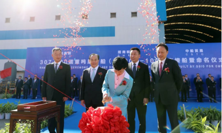 9月24日,中國船舶集團旗下大船集團聯(lián)合中船貿(mào)易為招商局集團旗下招商輪船建造的30萬噸VLCC “新伊敦”輪正式命名交付。同日,大船集團聯(lián)合中船貿(mào)易成功承接了招商輪船2艘17.5萬立方米大型LNG運輸船新造項目。中國船舶集團黨組副書記、總經(jīng)理楊金成,黨組成員、副總經(jīng)理孫偉,招商局集團黨委書記、董事長繆建民,黨委副書記、總經(jīng)理胡建華,紀(jì)委書記、董事段湘暉,黨委委員、副總經(jīng)理李百安出席儀式??娊駷樾麓瑮罱鸪?、胡建華在儀式上致辭,段湘暉為新船砍纜。