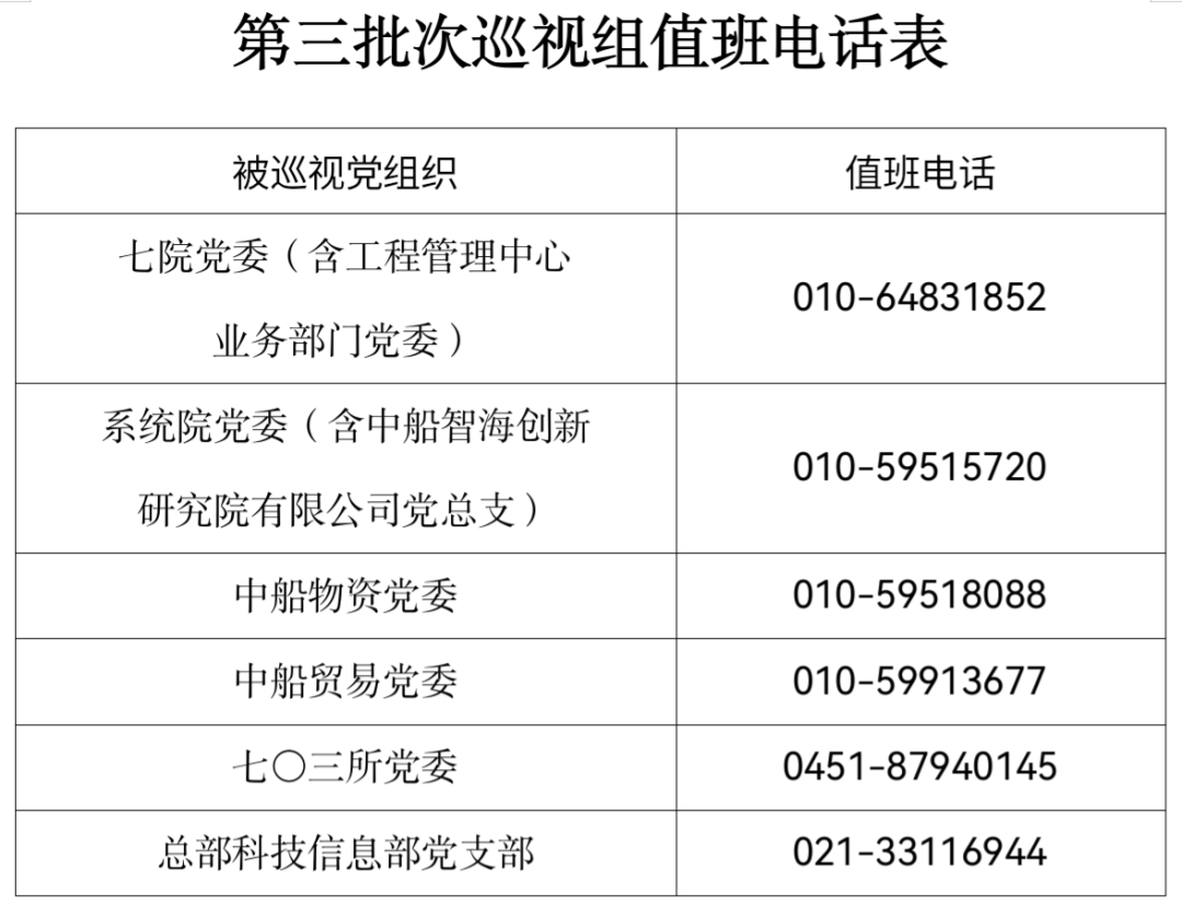 巡視期間,集團(tuán)公司黨組巡視組設(shè)置值班電話(huà)和聯(lián)系信箱,主要受理反映被巡視黨組織領(lǐng)導(dǎo)班子及其成員、下一級(jí)黨組織領(lǐng)導(dǎo)班子主要負(fù)責(zé)人和重點(diǎn)崗位領(lǐng)導(dǎo)干部問(wèn)題的來(lái)信、來(lái)電、來(lái)訪,重點(diǎn)關(guān)注違反政治紀(jì)律、組織紀(jì)律、廉潔紀(jì)律、群眾紀(jì)律、工作紀(jì)律、生活紀(jì)律以及巡視整改等方面問(wèn)題反映。第三批次巡視受理信訪截止時(shí)間為9月22日。