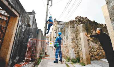 南方電網(wǎng)廣東汕頭金平供電局運(yùn)維人員對當(dāng)?shù)匾惶幣f線路進(jìn)行改造。(潘軍 攝)