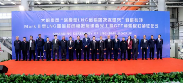 ????2019年11月26日,大船集團舉行“薄膜型LNG運輸船技術研究”科研專項MarkⅢ型LNG船全封閉模擬艙建造完工暨GTT和船級社頒證儀式。法國GTT公司、英國勞式船級社和中國船級社代表在模擬艙建造現場向大船集團代表頒發證書。