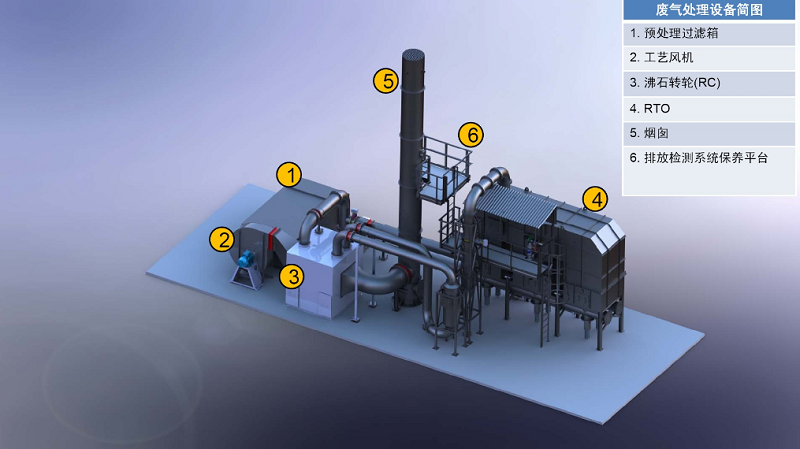 ????“多轉輪+RTO”處理工藝:兩套或多套沸石轉輪作為吸附濃縮裝置,1臺RTO(蓄熱式氧化爐,具備一定蓄熱能力的燃燒爐,通過高溫氧化的方式將氣體中的可燃物質進行氧化,達到使氣體凈化的目的)作為燃燒凈化裝置的VOCs處理工藝。