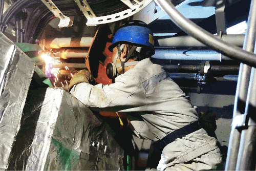 為保證臺風(fēng)來臨前能夠進(jìn)入錨地安全拋錨,大連公司海工公司員工戰(zhàn)高溫?fù)尮?jié)點(diǎn),狹小的空間里進(jìn)行焊接作業(yè)。