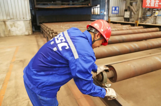 維修工閆師傅正在酷暑中檢修預(yù)處理生產(chǎn)線(xiàn)輥道。