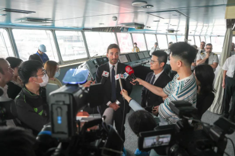 船東在MOBY豪華客滾船1號船啟航儀式上接受媒體采訪