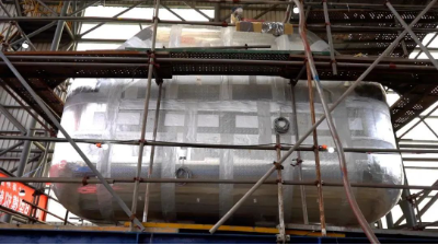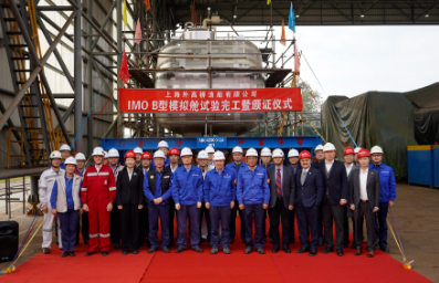 該B型模擬艙艙容為48立方米,艙室及氣室外形和節點型式皆與實船艙型保持一致,材質為9NI鋼。本次模擬艙建造完工,驗證了外高橋造船自主完成B型艙的設計、生產制造和質量控制等全流程的能力,為實船建造打下堅實基礎。