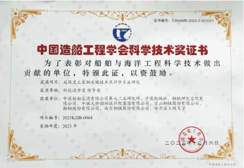 近日,中國造船工程學會發(fā)布了2023年科學技術(shù)獎評審結(jié)果,中國船舶集團七二五所申報的“高強度止裂鋼關(guān)鍵技術(shù)及評價方法研究”榮獲科技進步獎特等獎。項目團隊歷經(jīng)十余年技術(shù)攻關(guān),在國際上首次提出了止裂性能大尺寸雙重拉伸試驗方法和小尺寸替代試驗方法,并成功將其納入國際船級社協(xié)會(IACS)通用規(guī)范,極大提升了我國在該領(lǐng)域的國際話語權(quán)和技術(shù)影響力。