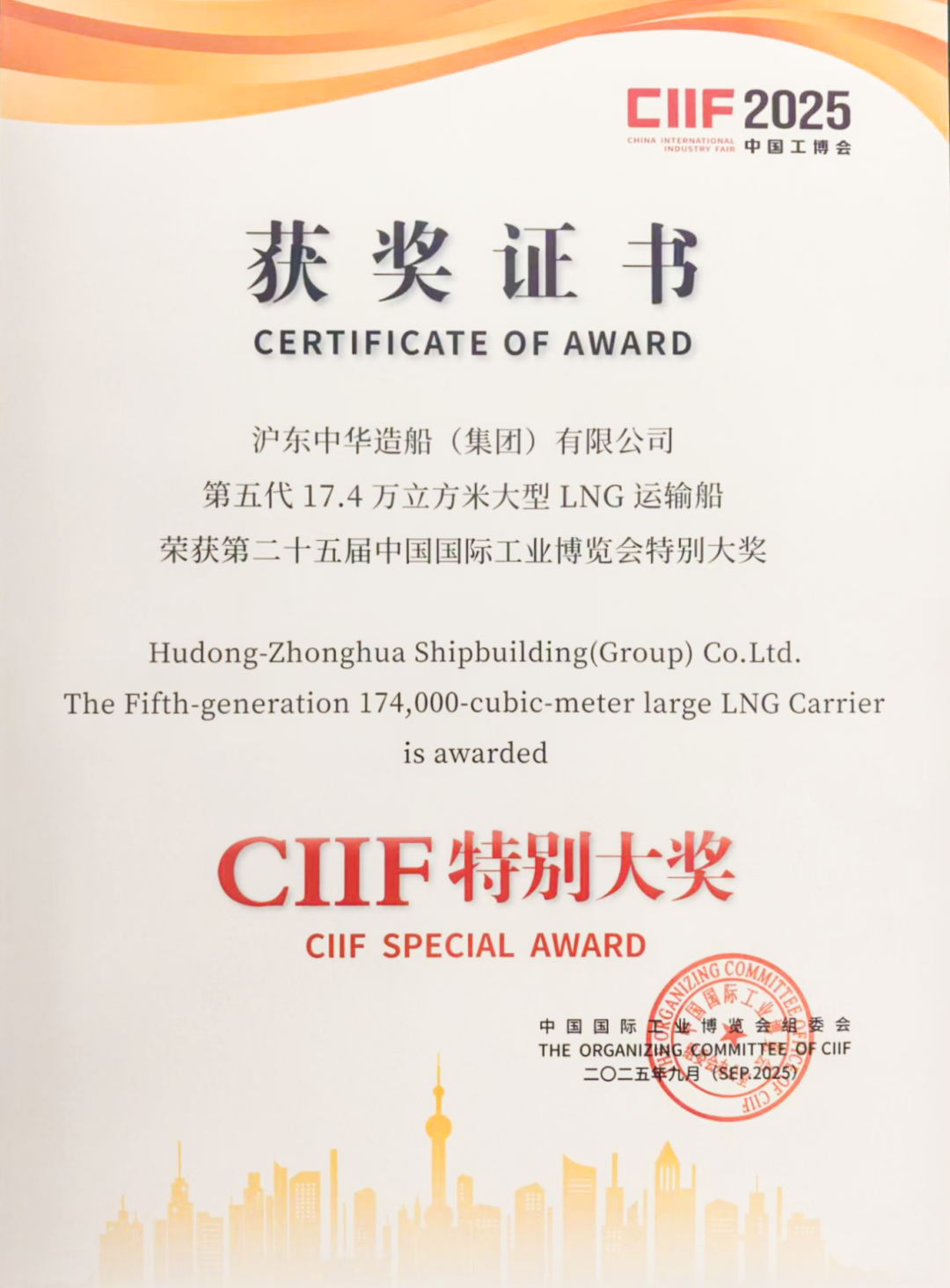 近日,中國船舶集團有限公司旗下滬東中華自主研發的第五代“長恒系列”17.4萬立方米雙燃料動力低速推進LNG船,從數百個參賽項目中脫穎而出,摘下第二十五屆中國國際工業博覽會唯一的CIIF特別大獎。