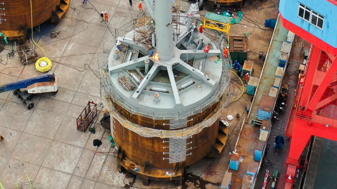 7月31日,廣船國際建造的我國第一臺吸力筒導管架風機基礎,在廣州南沙成功發(fā)運。吸力筒導管架是海上風電場的基礎設備,這次交付的吸力筒導管架總高63米,足有20層樓的高度,總重量約為1560噸,相當于15輛重型卡車滿載的重量,由3個直徑約為13米、高約11米的吸力筒和高52米的上部導管架組成。