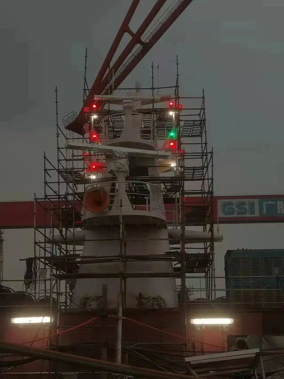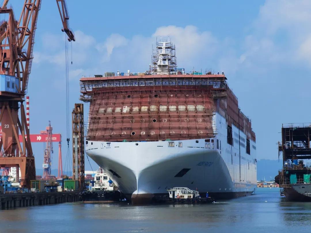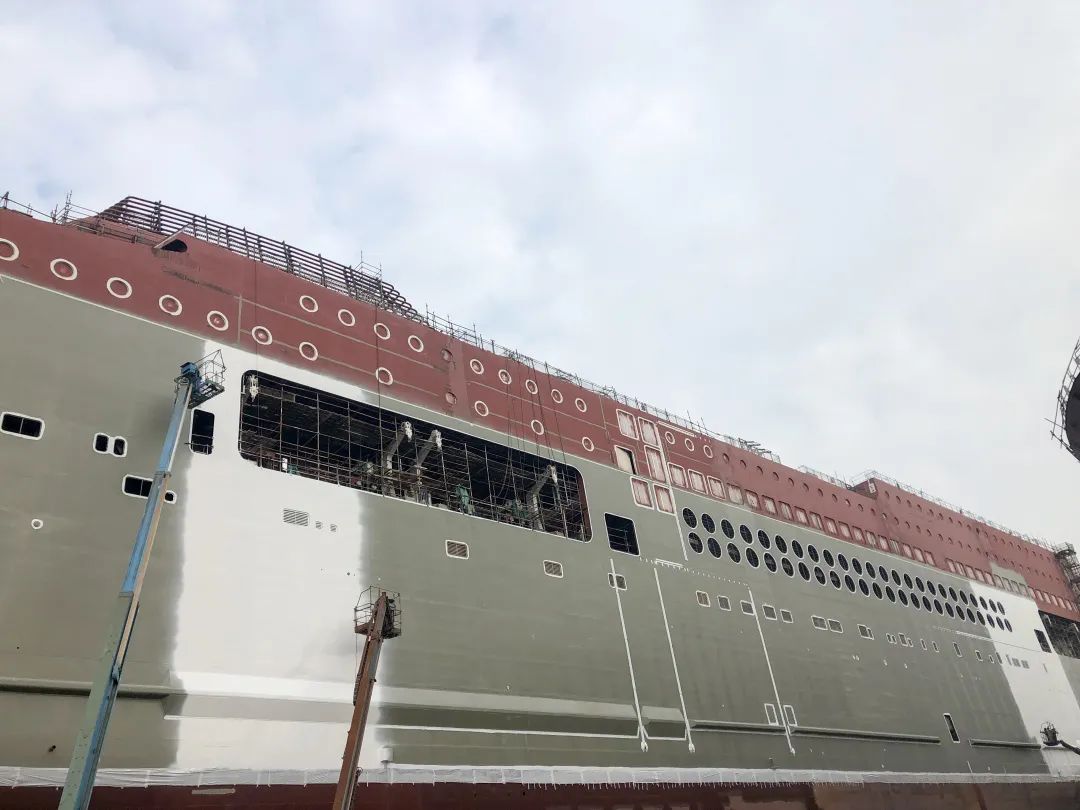 該船實(shí)現(xiàn)了出塢前上建亮燈。電纜拉放完成率87.8%,作為全球最大的豪華客滾船,該船全船電纜長(zhǎng)度達(dá)到了946公里(相當(dāng)于從廣州到重慶);出塢前已完成了830公里電纜的拉放工作。涂裝完整性實(shí)現(xiàn)突破,該船出塢時(shí)上層建筑上方仍有部分區(qū)域未完成涂裝? 這是因?yàn)樵摯怪备叨纫呀咏?0米,超過了船塢高空車的最大極限。