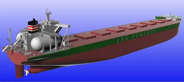 18萬噸好望角型雙燃料散貨船由外高橋造船自主設(shè)計(jì),采用LNG燃料和傳統(tǒng)燃料油驅(qū)動(dòng),共配置兩個(gè)C型LNG燃料罐,可一次性滿足完成中國至澳大利亞航線兩個(gè)來回或中國至巴西航線一個(gè)來回的路程需求。在LNG燃料模式下,該船基本消除顆粒物和硫化物的排放,滿足國際海事組織IMO第四階段規(guī)范要求,具有綠色、環(huán)保、節(jié)能、安全等顯著特色。