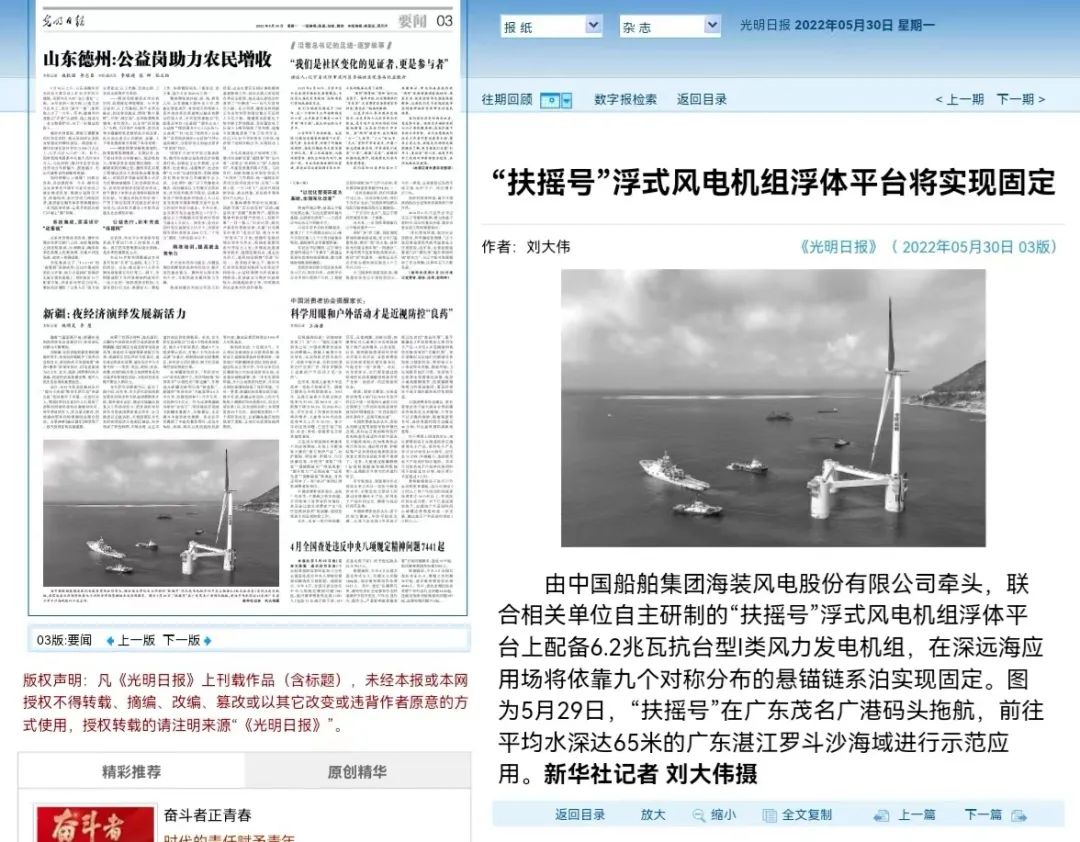 5月29日,中國船舶集團旗下中國海裝牽頭研制的國內(nèi)首臺深遠海浮式風(fēng)電裝備——“扶搖號”從廣東茂名碼頭起航,前往平均水深65米的廣東湛江附近海域投入示范應(yīng)用。