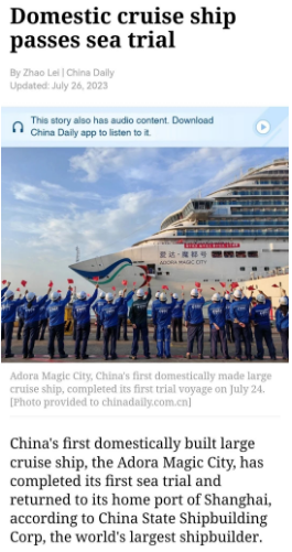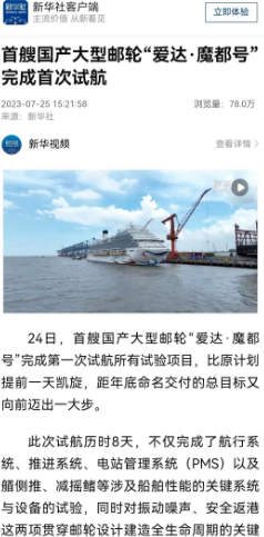 7月24日晚,首艘國產(chǎn)大型郵輪“愛達(dá)·魔都號”完成第一次試航所有試驗項目比原計劃提前一天凱旋,人民日報、新華社、中央電視臺等中央主流媒體進(jìn)行了報道。