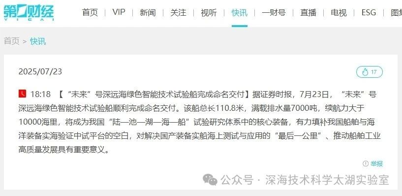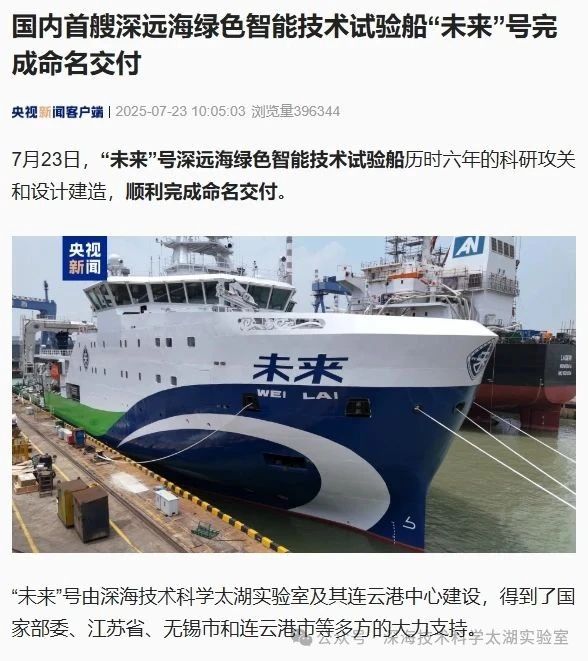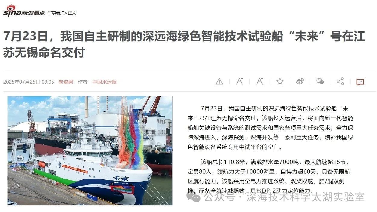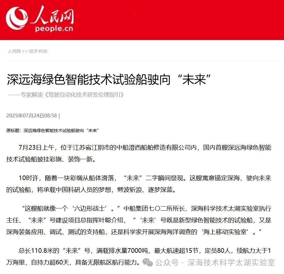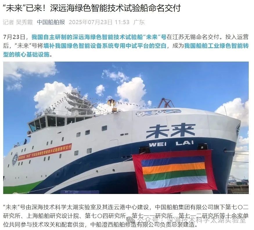 7月23日,由深海技術科學太湖實驗室歷時六年科研攻關和設計建造的“未來”號正式命名交付。中船集團旗下七〇二所、上船院、七〇四所、七一一所、七一二所等十余家單位共同參與技術攻關和配套供貨,中船澄西負責總裝建造人民日報、新華社、央視新聞、科技日報等主流媒體共同聚焦這一“國之重器”。