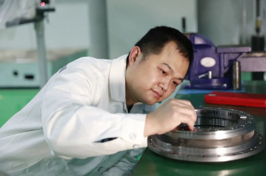 “必須持之以恒地以精益求精、精雕細琢的工匠精神打造所經手的每個產品!”這是周虎常提的一句話。燃氣輪機機匣零組件制造精度要求高,裝配質量控制嚴,其加工、裝配工藝技術代表機械制造行業的先進水平。武漢船機首套燃氣輪機機匣產品裝配工作由周虎帶領班組成員進行,其高超的技能水平保障了產品的裝配質量與進度。在25兆瓦燃氣輪機過渡段機匣葉片裝配過程中,因葉片與機匣外環裝配為燕尾槽式的榫接結構,葉片榫頭與燕尾榫槽三面的接觸面積要求高達80%以上,需由鉗工拂配以達該指標。葉片榫頭拂配過程中,周虎采用銼刀銼削裝配面,利用其長期磨練掌握的良好手感,將銼削量誤差控制在0.005-0.01毫米,大大減少了葉片試裝配次數,裝配效率顯著提升。