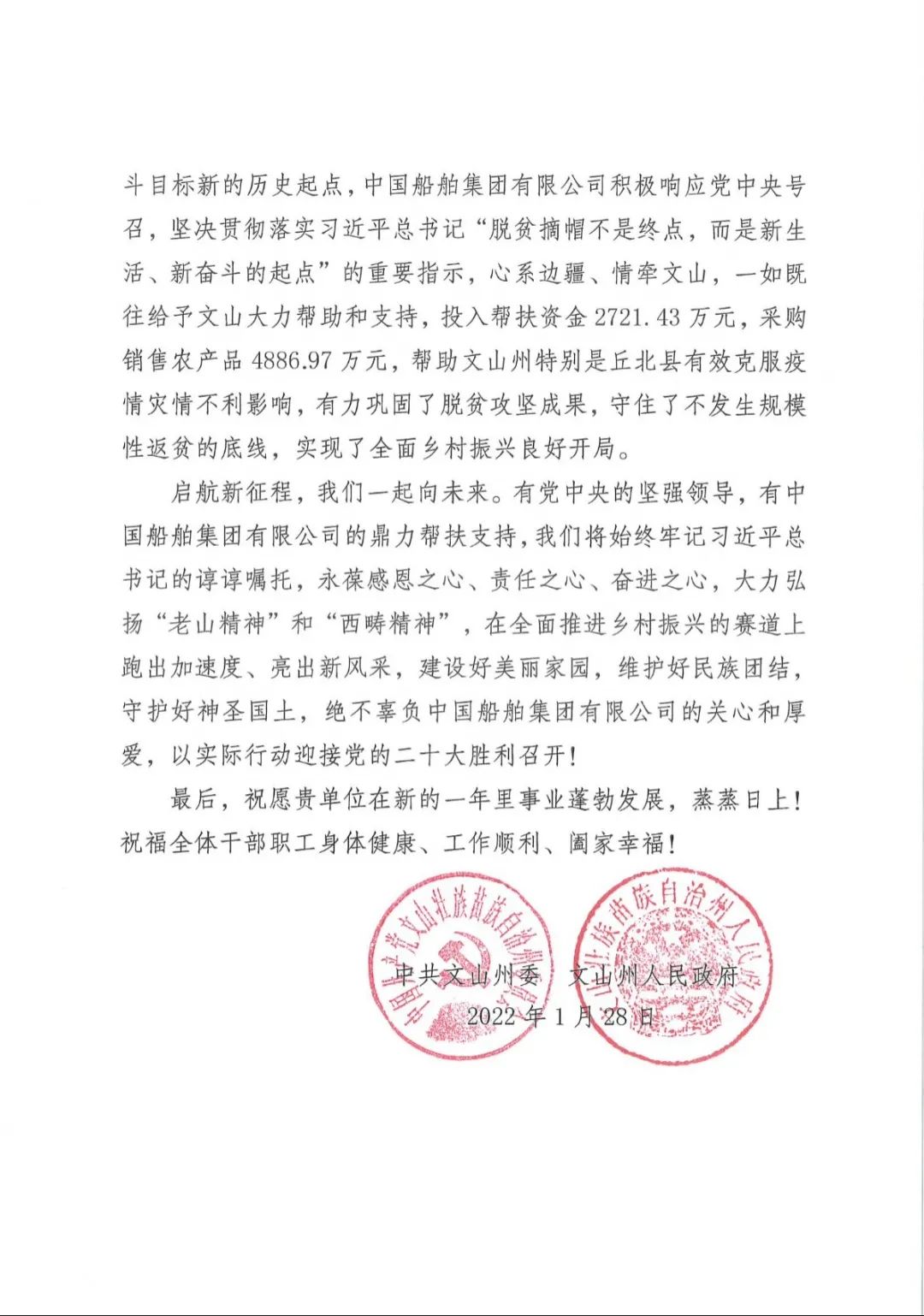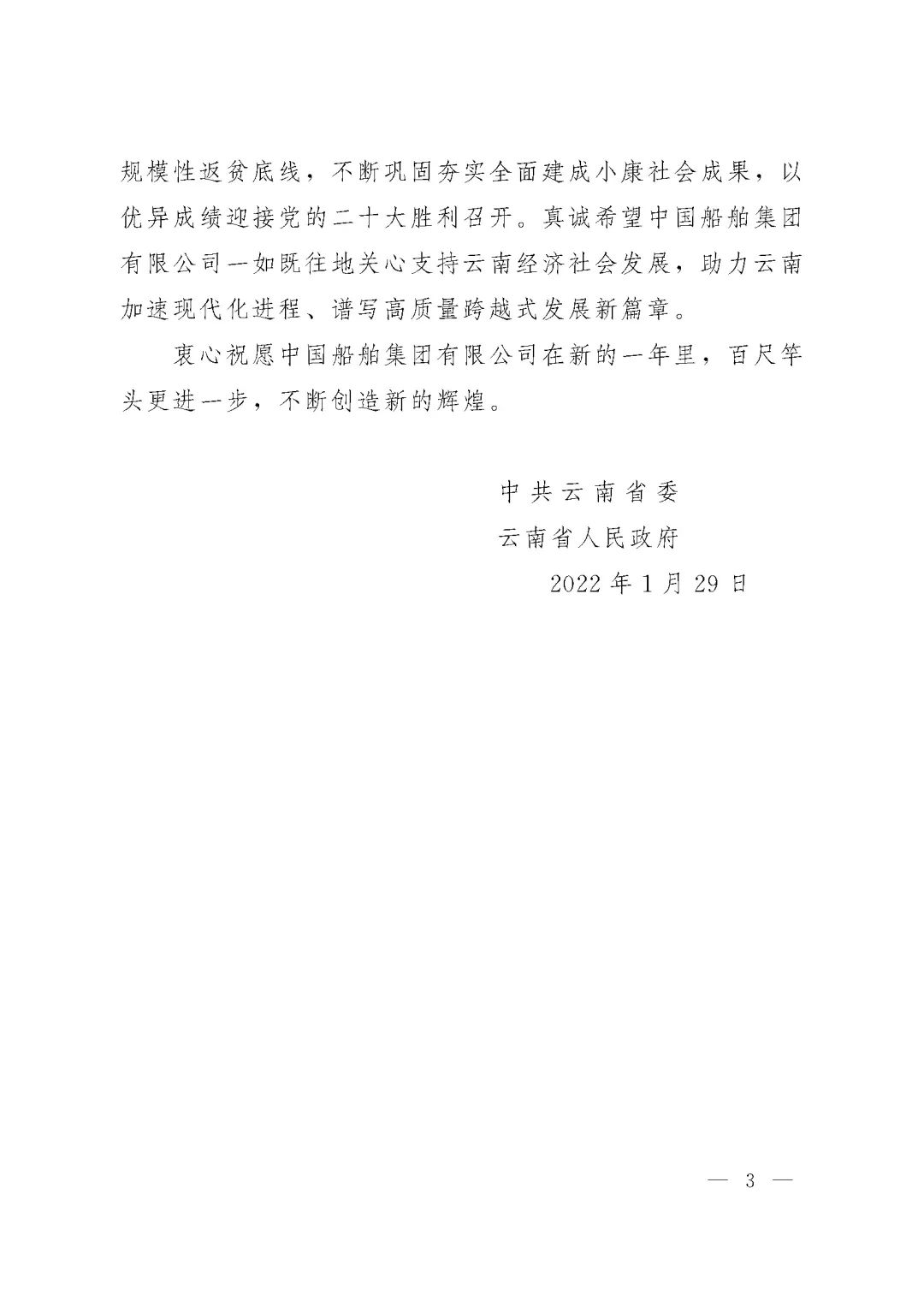 春節(jié)前夕,中國(guó)船舶集團(tuán)陸續(xù)收到云南省委省政府、文山州委州政府、鶴慶縣委縣政府、勐臘縣政府發(fā)來(lái)的感謝信,對(duì)集團(tuán)公司長(zhǎng)期以來(lái)給予鶴慶縣、勐臘縣、丘北縣的傾力幫扶表示衷心感謝和崇高敬意。