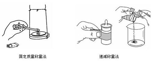 固定質(zhì)量稱量法如圖所示。注意:若不慎加入試劑超過指定質(zhì)量,應(yīng)先關(guān)閉升降旋鈕,然后用牛角匙取出多余試劑。重復(fù)上述操作,直至試劑質(zhì)量符合指定要求為止。嚴(yán)格要求時,取出的多余試劑應(yīng)棄去,不要放回原試劑瓶中。操作時不能將試劑散落于天平盤等容器以外的地方,稱好的試劑必須定量地由表面皿等容器直接轉(zhuǎn)入接受容器,此即所謂“定量轉(zhuǎn)移”。
